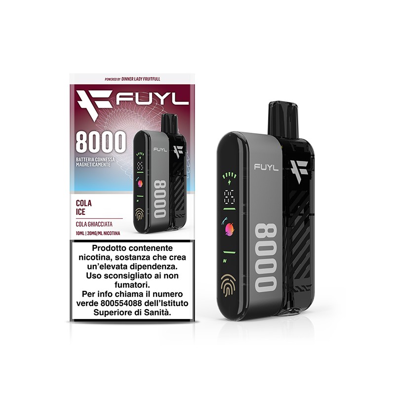 The Dinner Lady Fuyl 8000 Starter Kit is an e-cigarette with a 650mAh rechargeable battery and a 10ml pre-filled disposable pod in Cola Ice flavor. It contains 20mg/ml of nicotine. Compatible with all pre-filled Fuyl 8000 pods.