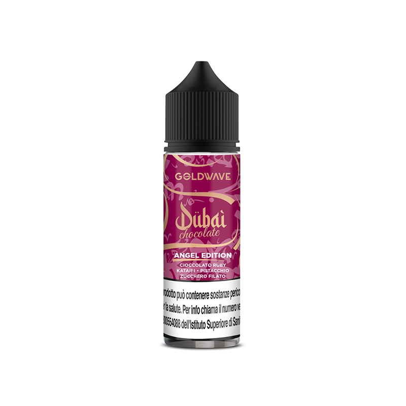 Goldwave Dubai Chocolate Angel Edition is a 20ml shot in a 60ml bottle. Ruby chocolate, pistachio, and kataifi intertwine with a hint of cotton candy for an ethereal and enveloping balance.