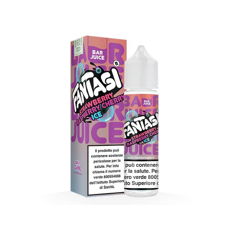Fantasi Bar Juice Strawberry Raspberry Cherry Ice is a 20ml vape shot in a 60ml bottle. It features strawberry, raspberry, and frozen cherry flavors.