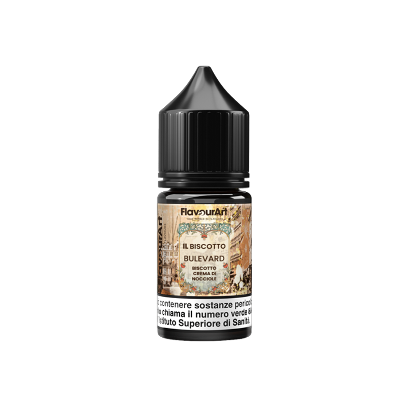 Flavourart Bulevard Biscuit is a 10ml vape shot in a 30ml bottle. It features a Biscuit flavor with hazelnut cream.