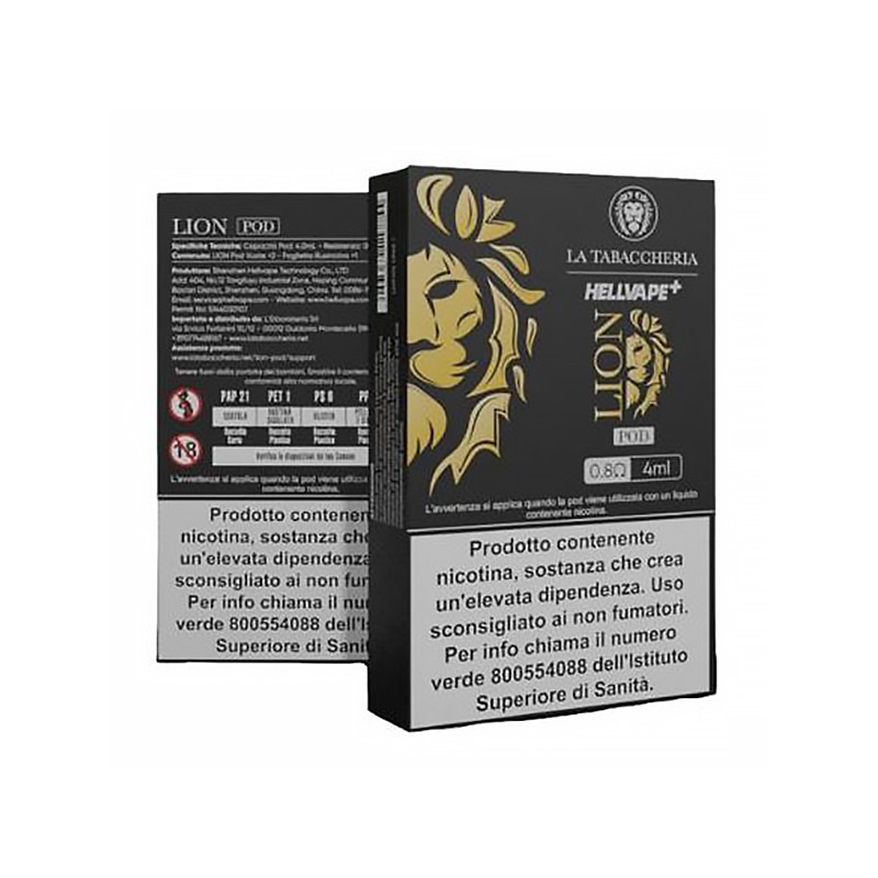 Lion Pod – Replacement cartridges compatible with the Lion e-cigarette by La Tabaccheria / Hellvape. 4 ml liquid capacity, convenient and clean side refill, integrated 510 drip tip, and fixed 0.8Ω resistance for MTL/RDL use. Pack of 2 pods.