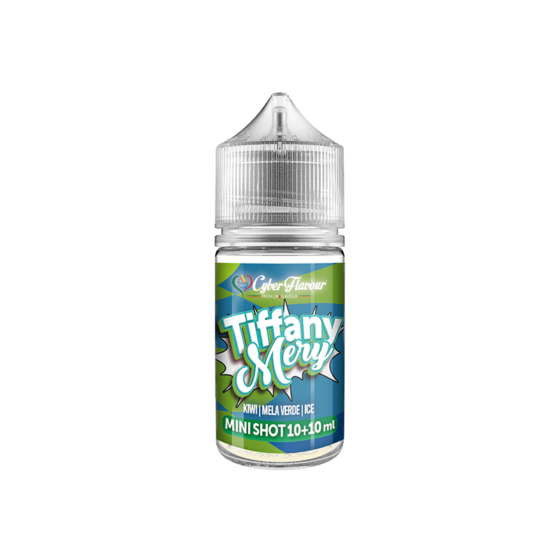 Cyber Flavor Tiffany Mery is a 10 ml mini shot in a 30 ml bottle. It features Kiwi, Green Apple, and Ice flavors.
