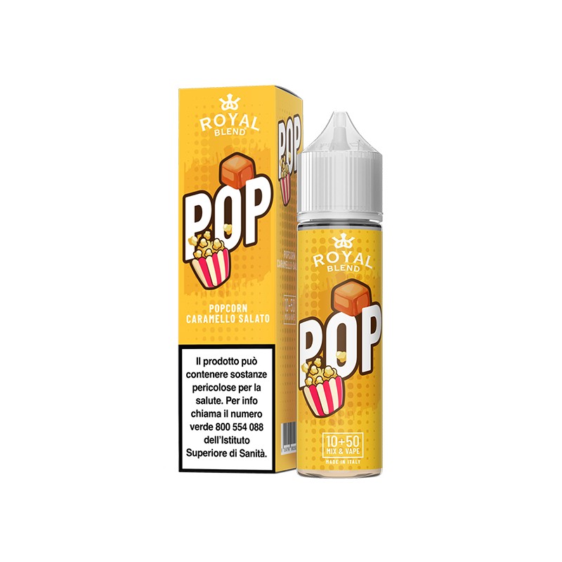 Royal Blend Pop is a 10ml vape shot in a 60ml bottle. It features a salty caramel and pop corns flavor.