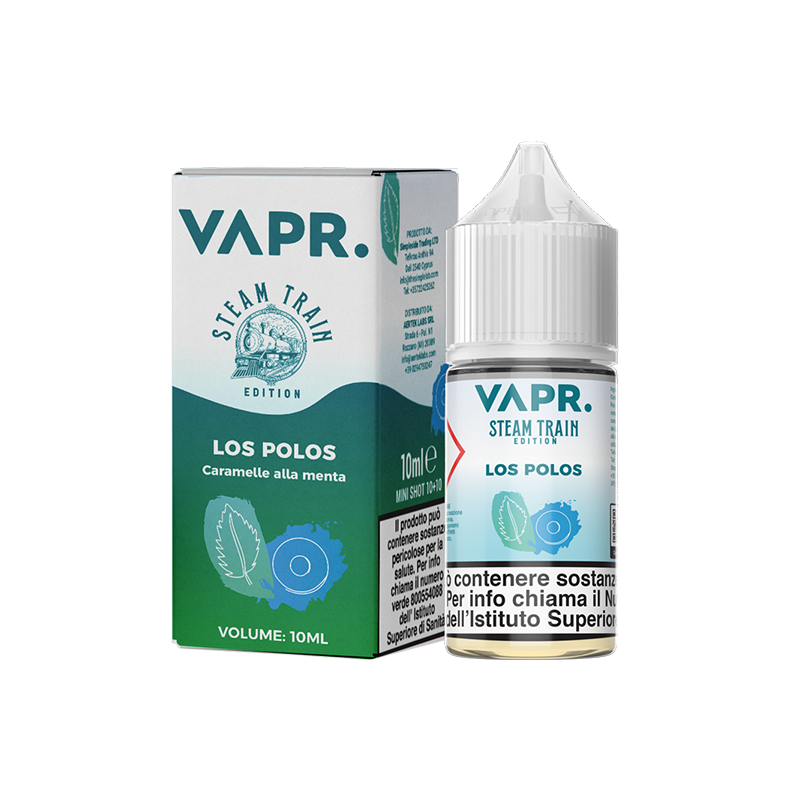 VAPR. Los Polos - Steam Train Edition is a 10 ml mini shot in a 30 ml bottle, with a mint candy flavor, fresh, sweet, and pleasantly balsamic. Created in collaboration with Steam Train, it offers an intense and well-defined aroma, with a persistent and satisfying freshness. Designed to offer an intense and immediate aromatic boost, it is ideal for new vapers looking to switch from disposable e-cigarettes to a refillable system, without sacrificing a rich and satisfying flavor.