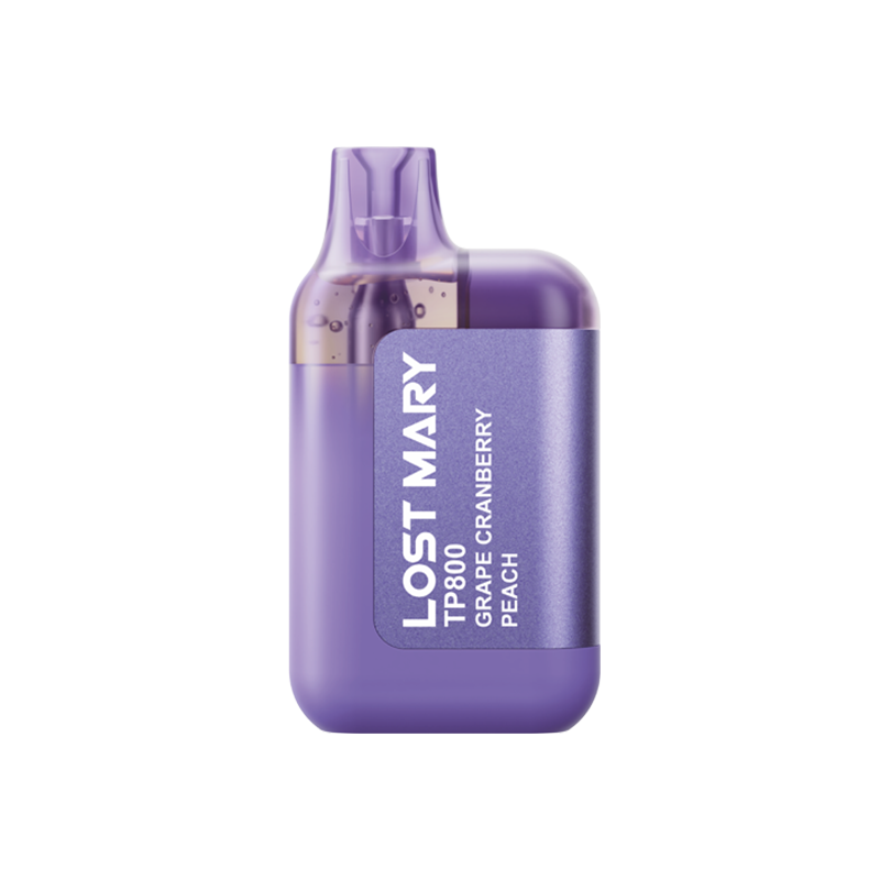 Lost Mary TP800 disposable e-cig with Grape, Cranberry, and Peach flavors. Liquid capacity: 2ml. Power: 550mAh - 20mg/ml nicotine salts.