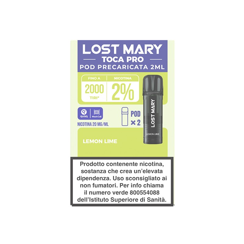 Lost Mary Toca PRO Preloaded Pod - Lemon Lime with nicotine salts. Package includes 2 pods. Note: The pod cannot be used individually. It is compatible with all Lost Mary Toca Kits, sold separately.