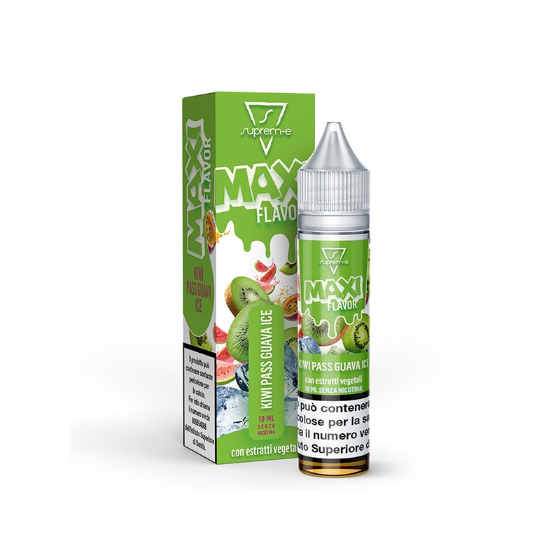 Suprem-e Maxi Flavor Kiwi Pass Guava Ice is a 10 ml shortfill eLiquid in a 20 ml bottle - 0 mg/ml. Flavored with kiwi, passion fruit, and frozen guava.