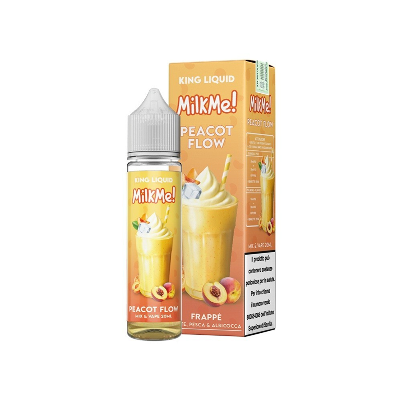 King Liquid Milkme! Peacot Flow is a 20ml mix-and-vape e-liquid in a 60ml bottle, with a peach and apricot flavor. Sweet, summery, and enveloping.