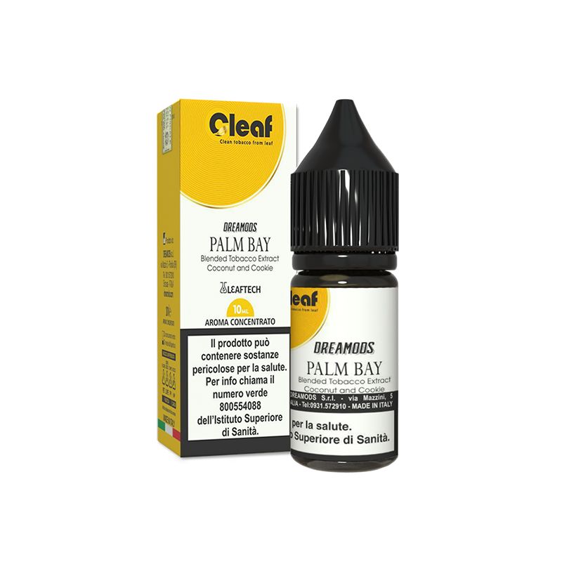 Dreamods CLEAF Palm Bay è un aroma concentrato da 10 ml in un flacone da 10 ml. Al gusto di Tabacco del Virginia e Biscotto al Cocco.