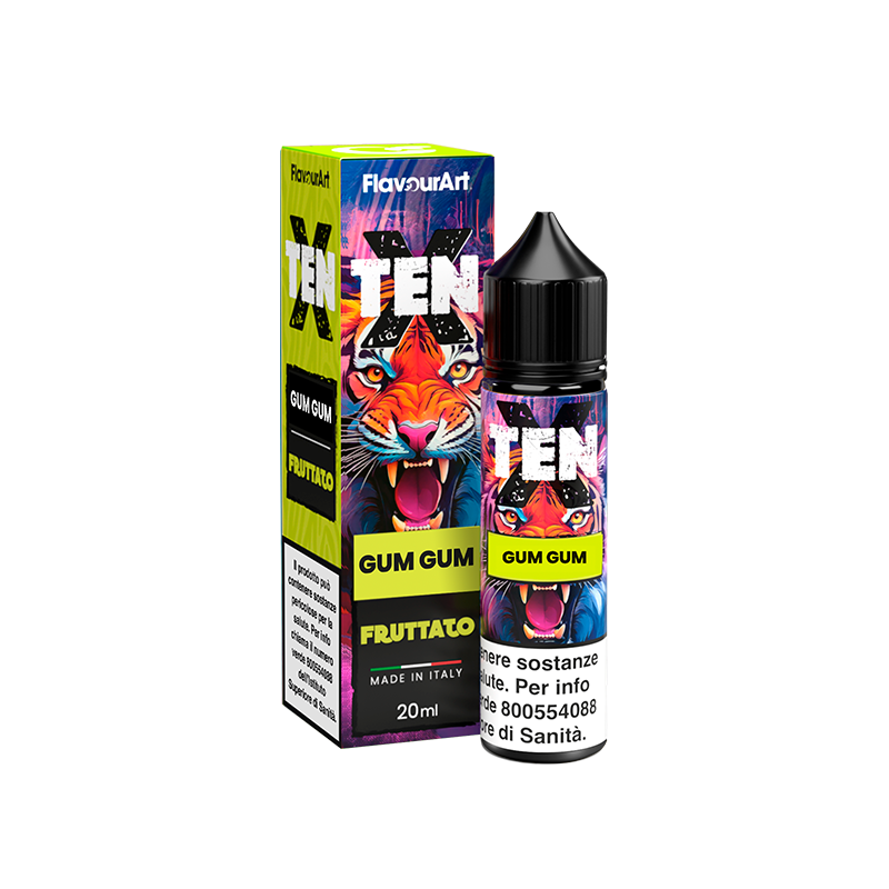 Flavourart TenX Gum Gum è un vape shot da 20ml in un flacone da 60ml. Gusto gomma da masticare fruttata.