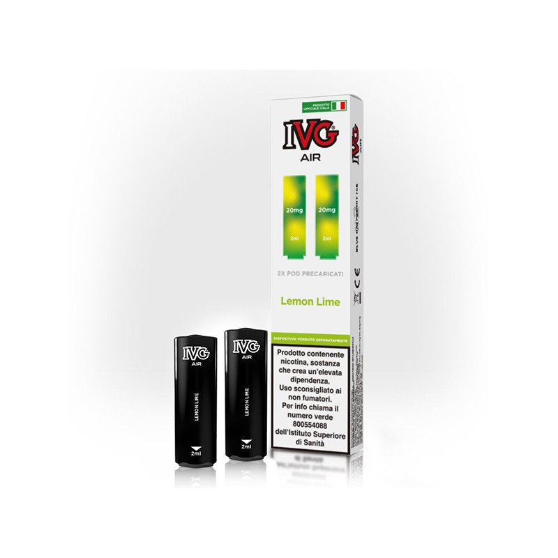 IVG Air Prefilled - Lemon Lime al gusto di Limone e Limetta. La confezione include 2pz. Nota: La pod non è utilizzabile singolarmente. È compatibile esclusivamente con il IVG AIR STARTER KIT, venduto separatamente.