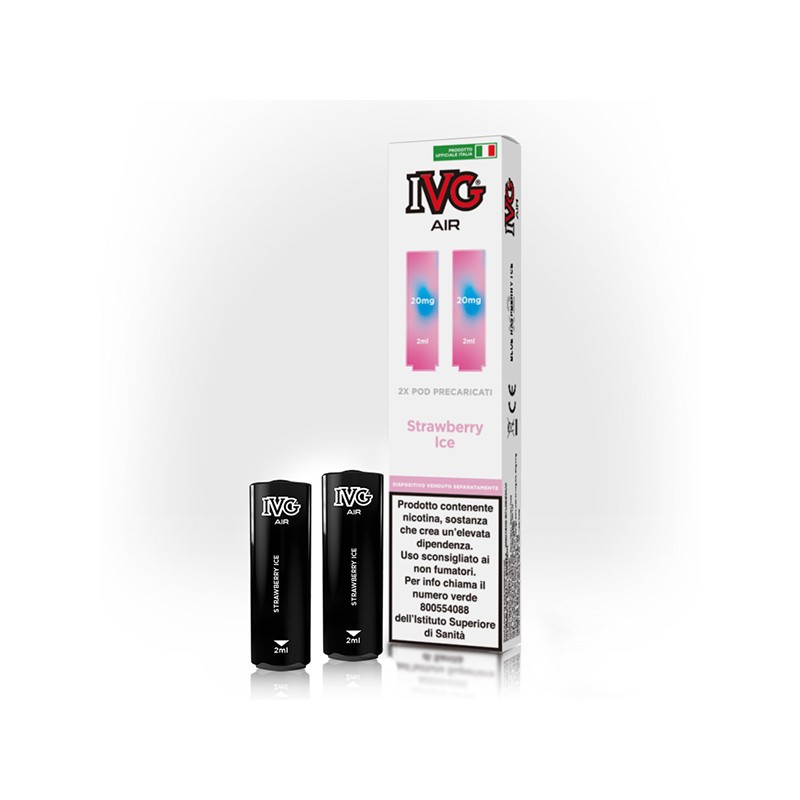 IVG Air Prefilled - Strawberry Ice al gusto di fragola ghiacciata. La confezione include 2pz. Nota: La pod non è utilizzabile singolarmente. È compatibile esclusivamente con il IVG AIR STARTER KIT, venduto separatamente.