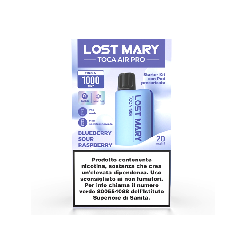 Lost Mary Toca Air Pro Kit è una sigaretta elettronica con una batteria ricaricabile da 750mAh e una pod precaricata usa e getta da 2ml al gusto di Mirtillo e Lampone acidulo con sali di nicotina.