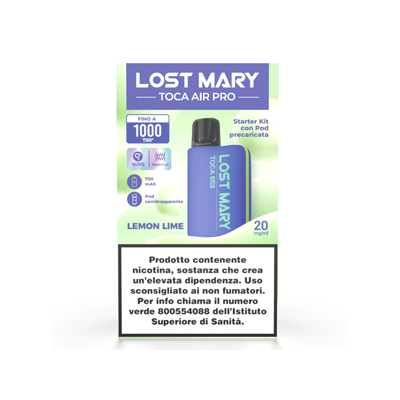 Lost Mary Toca Air Pro Kit è una sigaretta elettronica con una batteria ricaricabile da 750mAh e una pod precaricata usa e getta da 2ml al gusto di Limone e Lime con sali di nicotina.