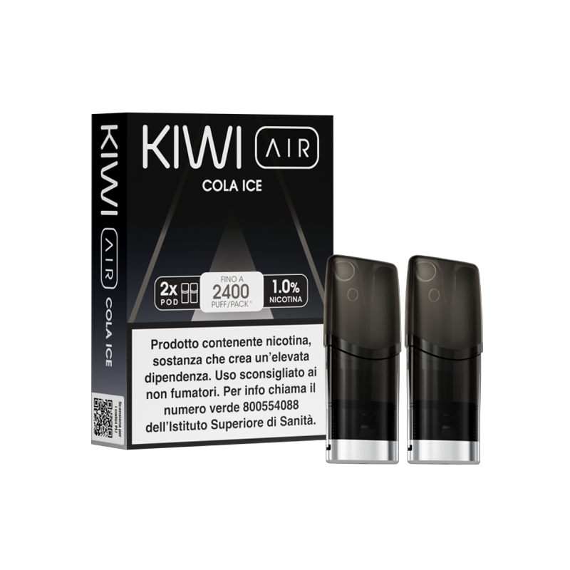 Kiwi Air Pod Precaricate - Cola Ice al gusto Ghiacciato di Cola. La confezione include 2pz. Nota: La pod non è utilizzabile singolarmente. È compatibile esclusivamente con il Kiwi Air Kit, venduto separatamente.