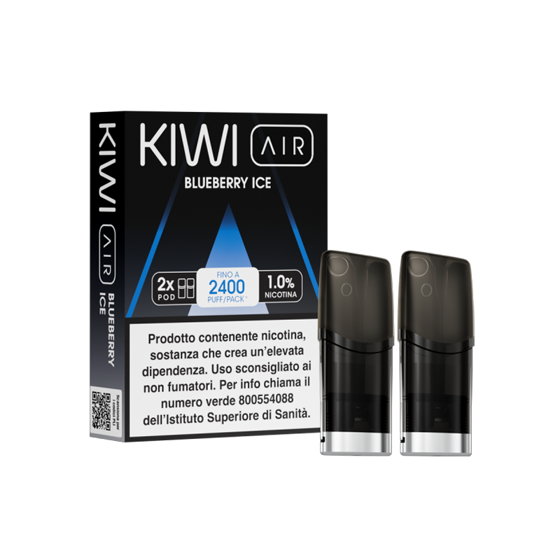 Kiwi Air Pod Precaricate - Blueberry Ice al gusto Ghiacciato di Mirtillo. La confezione include 2pz. Nota: La pod non è utilizzabile singolarmente. È compatibile esclusivamente con il Kiwi Air Kit, venduto separatamente.
